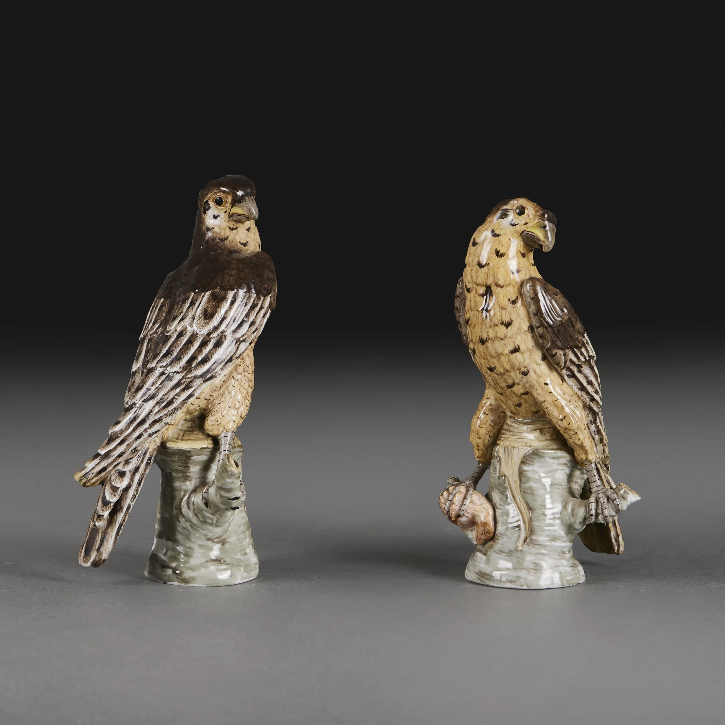 A fine pair of mid nineteenth century pottery sparrow hawk sculptures, with finely painted feathers, the opposing hawks, perched on naturalistic branch bases. The hawks’ heads are turned to one side, surveying for competing predators. Attributed to KPM Berlin.